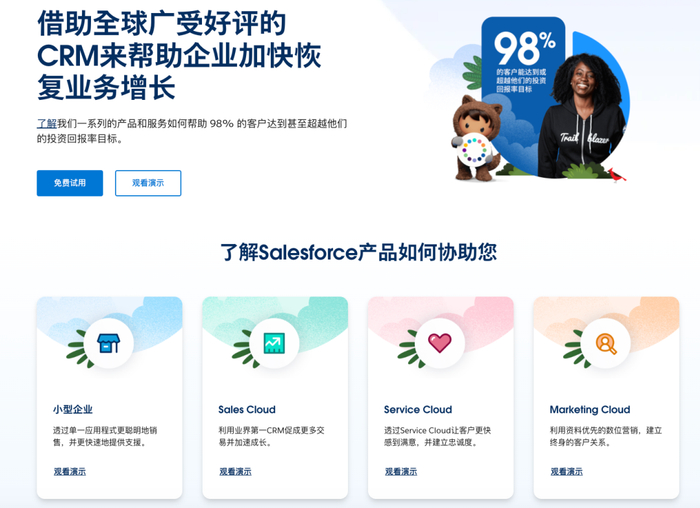 最后,根据需求来提出企业的解决方案,比如salesforce官网的介绍方式。