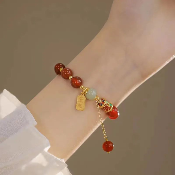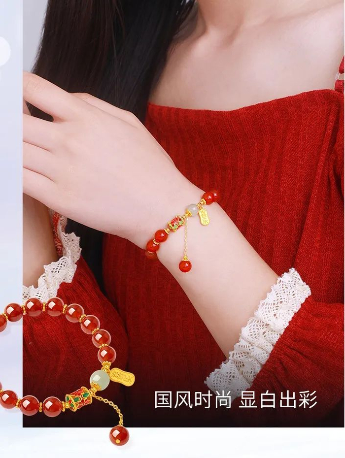 搭配的相得益彰,更显肤色!龙饺与朱砂的红色相映相衬,珠光闪耀,绝色腕间绕,尽显东方风雅。