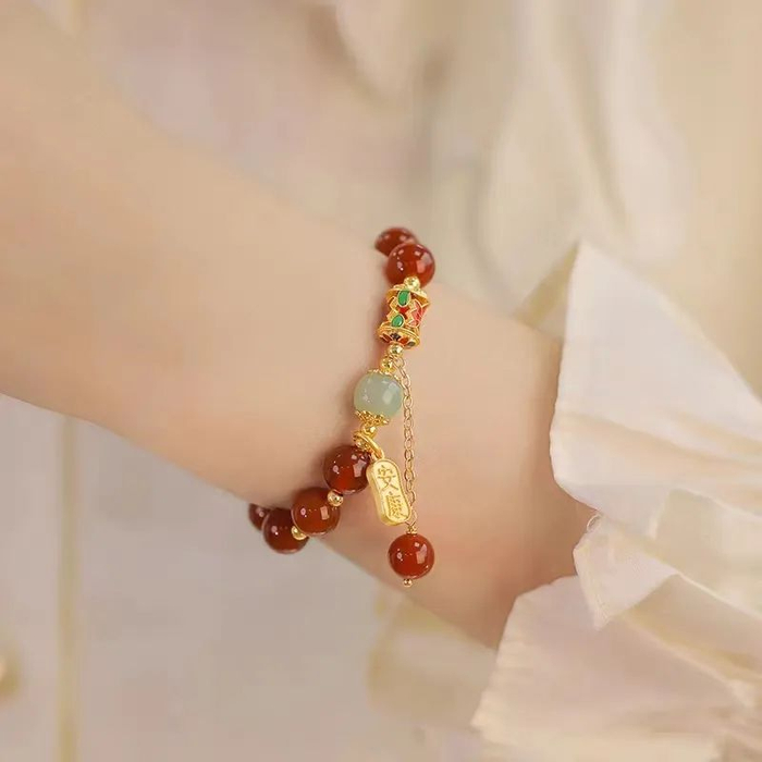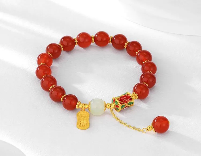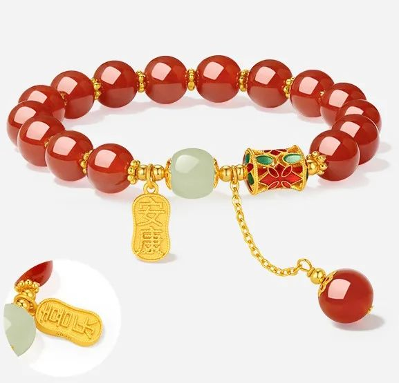 精选优质的朱砂/红玛瑙原材,加上温润和田玉和镀金高品质隔珠,