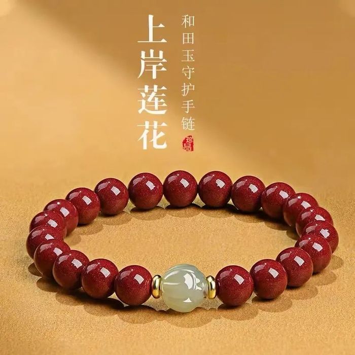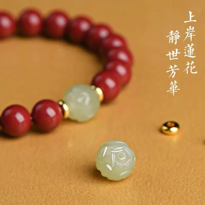 采用和田玉石雕琢出栩栩如生的莲花,点缀在朱砂串珠之间,提升整体古韵风情,别有一番雅致造型。