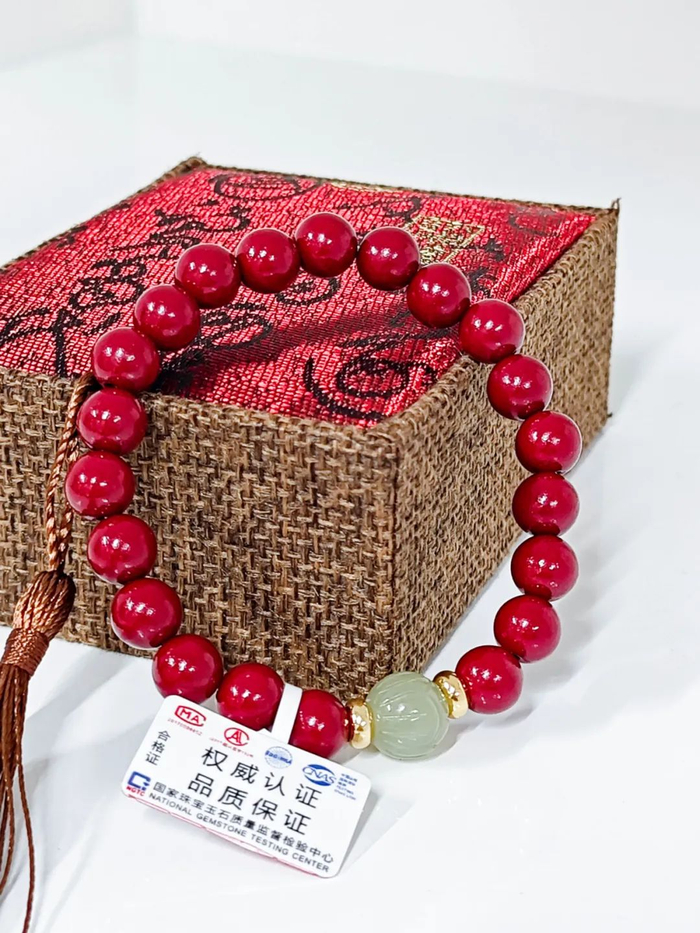 朱砂珠径大约8mm,小珠设计更适合手腕纤细的人,红红火火很显大气。