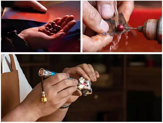 经过塑型-打磨-钻孔-抛光,重重工序之后精工制成的朱砂珠,每一颗都像是高级的艺术品圆润光滑。