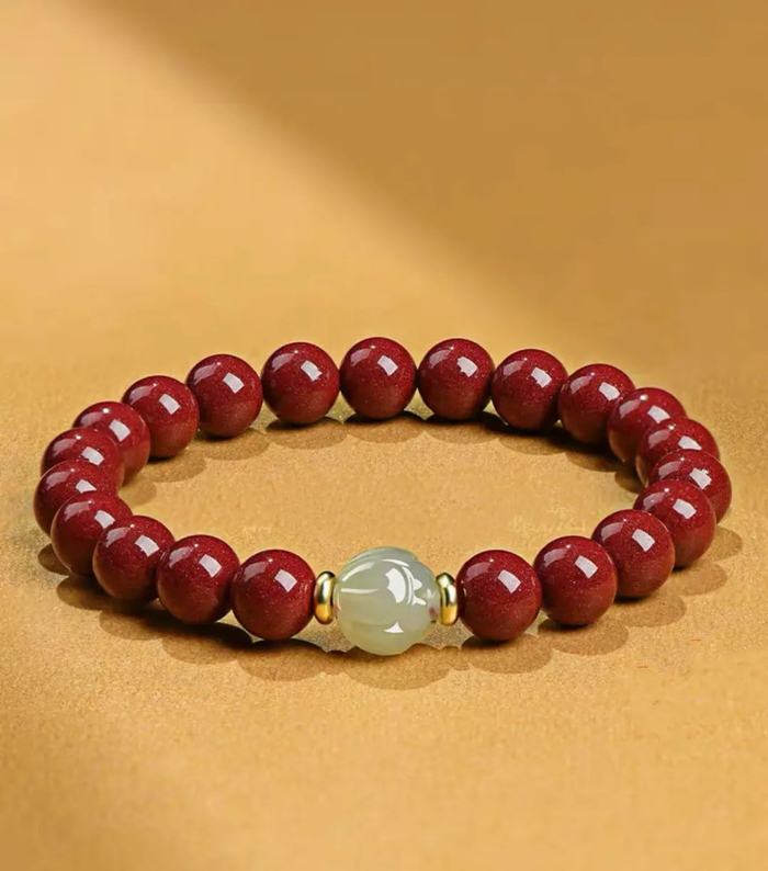 不仅仅选用优质好朱砂,其中还搭配和田玉石,以及镀金的挂坠,很好的体现出通透之美。