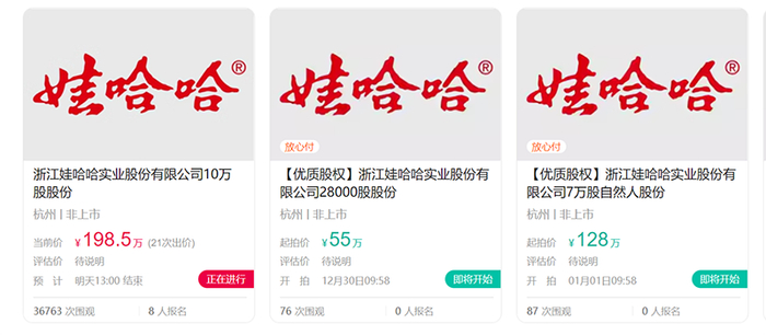 记者注意到,目前已有两宗娃哈哈实业的股权在阿里资产挂牌,其中有2.8万股股份计划于12月30日上午开拍,起拍价55万元;另一宗7万股股份将于1月1日上午开拍,起拍价为128万元。