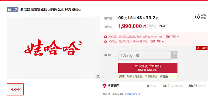 正在阿里资产进行网上拍卖的是浙江娃哈哈实业股份有限公司(以下简称“娃哈哈实业”)10万股股份,从12月28日13:00起开拍,起始价184万元,至28日晚9:22,经过22轮竞价,报价已更新至199万元。本次拍卖预计在2023年12月29日13:00截止(延时除外)。