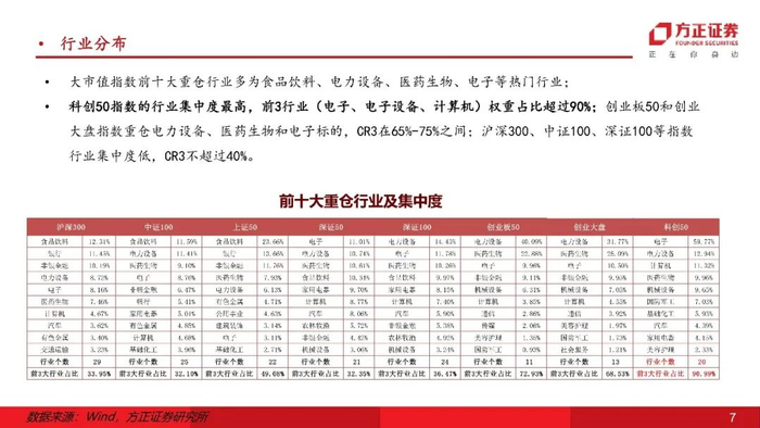 二、大市值指数前十大重仓行业多为食品饮料、电力设备、医药生物、电子等热门行业;科创50指数的行业集中度最高,前3行业权重占比超过90%;创业板50和创业大盘指数行业集中度适中,CR3在70%左右;沪深300、中证100、深证100等指数行业集中度低,CR3不超过40%。