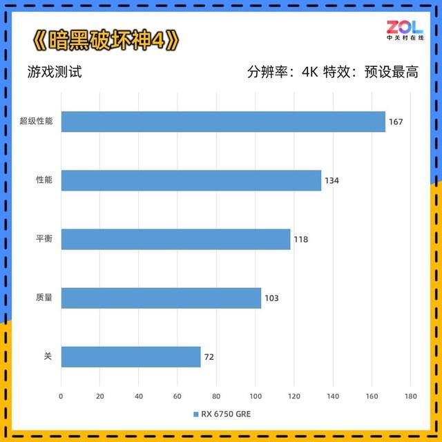 作为网游中颇为消耗性能的《暗黑破坏神4》,我们测试了4K分辨率下,RX 6750 GRE在AMD FSR超级性能模式中,甚至能达到167帧的电竞级水准。作为一款2000元出头的主流价位显卡,RX 6750 GRE在显存规格上可以说颇为奢侈。