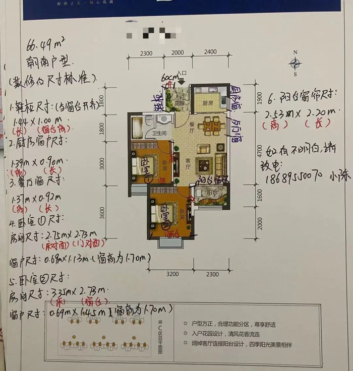 这是他已经提前测量好的户型图,上面清晰标注了每个位置的实量尺寸,并且留下电话,便于客户咨询。