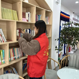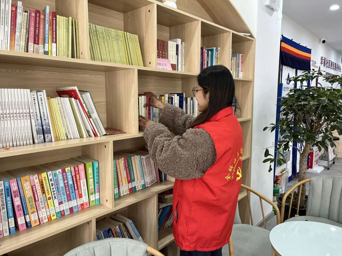在功德林街道,幸福社区的“全科社工”强珍正在整理党群服务中心的书籍(11月26日摄)。新华社发