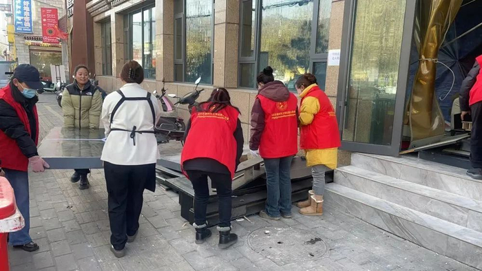 在功德林街道幸福社区,志愿者正在协助商户处理建筑垃圾(12月3日摄)。新华社发