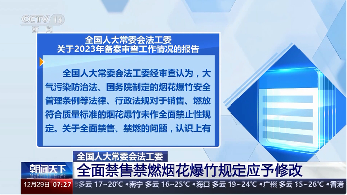 据央视新闻12月29日消息,全国人大常委会法工委关于2023年备案审查工作情况的报告,对群众和企业对有的地方性法规中全面禁售禁燃烟花爆竹等公众普遍关注的问题,给出了答案,提出审查建议。