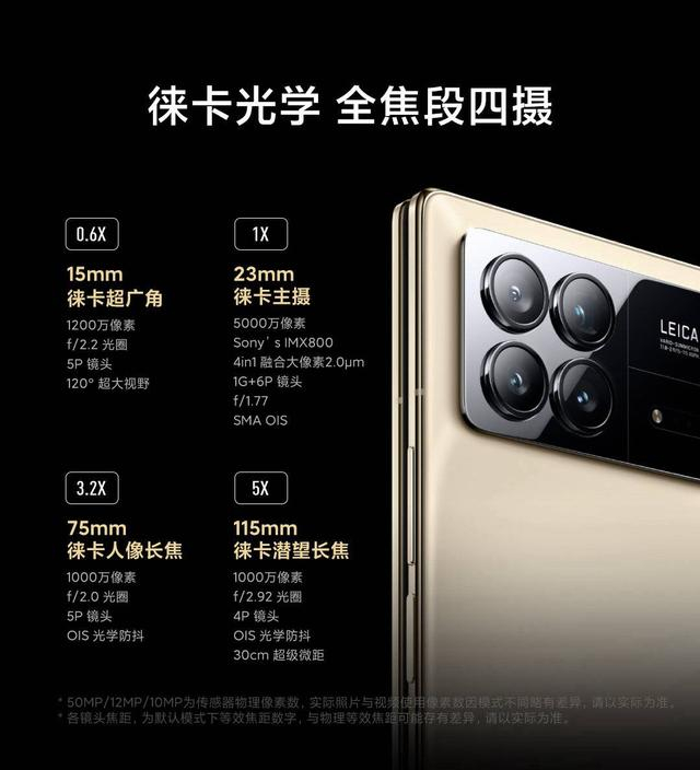 小米MIX Fold 3——小米的第三款折叠屏手机,四摄五焦段的影像配置配备了潜望式长焦,覆盖15mm-115mm焦段,主摄基于ISZ功能实现两倍焦距拓展,最高支持50倍数码变焦。