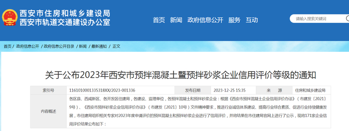 关于公布2023年西安市预拌混凝土暨预拌砂浆企业信用评价等级的通知