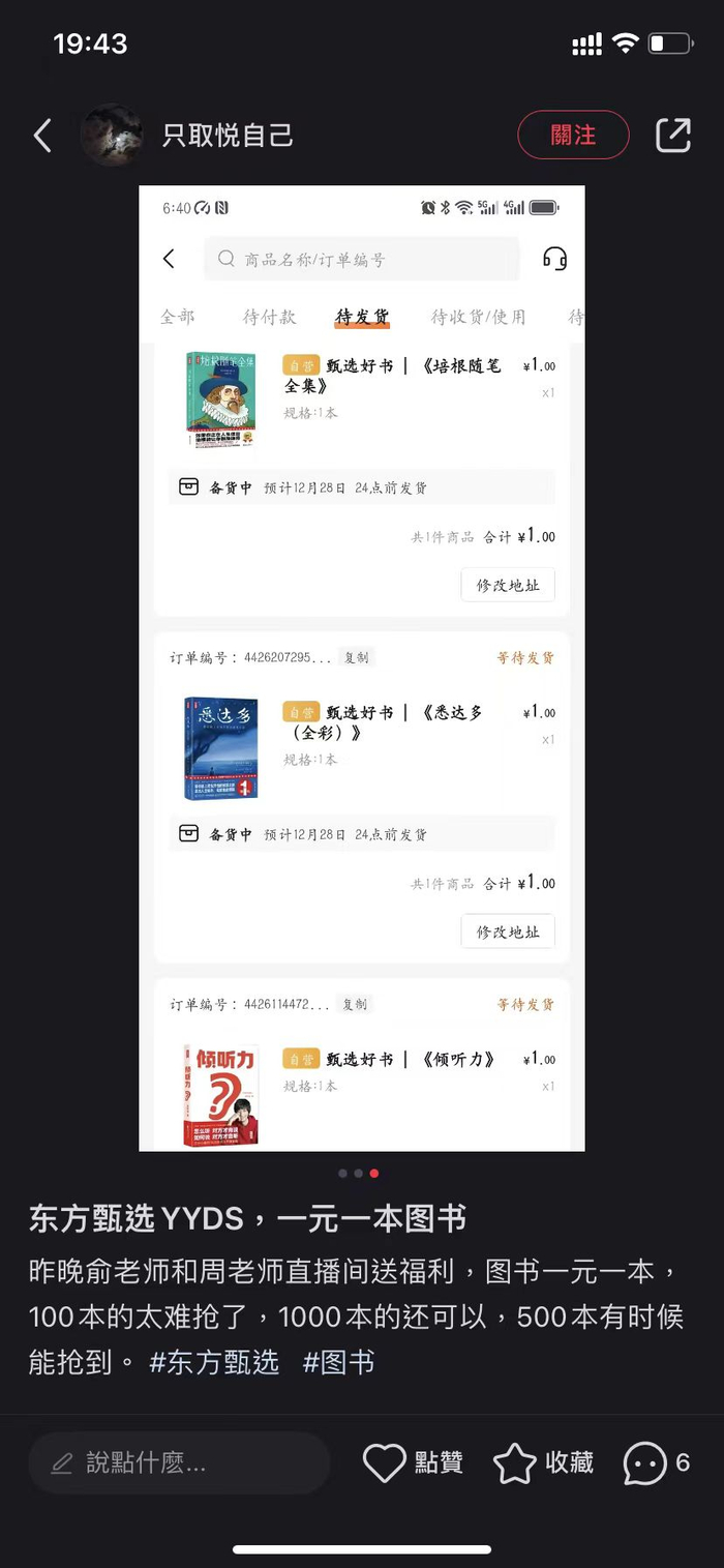 但参与本次抢书的读者少有疑虑,在此前东方甄选发布的微博“俞敏洪老师、周成刚老师与大家相约东方甄选App直播间,新年送好礼,5000本好书1元领”下方,不少网友打下了“期待”、“不见不散”等评论,还有人调侃称“这是他俩谁的书又卖不出去了”。
