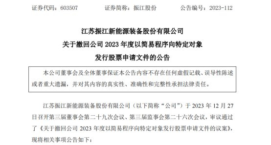 中国经济网北京12月29日讯 振江股份(603507.SH)昨日晚间发布《关于撤回公司2023年度以简易程序向特定对象发行股票申请文件的公告》称,公司于2023年12月27日召开第三届董事会第二十九次会议、第三届监事会第二十六次会议,审议通过了《关于撤回公司2023年度以简易程序向特定对象发行股票申请文件的议案》。