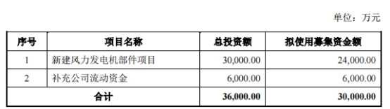 根据本次发行的竞价结果,发行对象拟认购金额合计299,999,976.76元,不超过人民币三亿元且不超过最近一年末净资产百分之二十;在扣除相关发行费用后的募集资金净额将用于以下项目:新建风力发电机部件项目、补充公司流动资金。