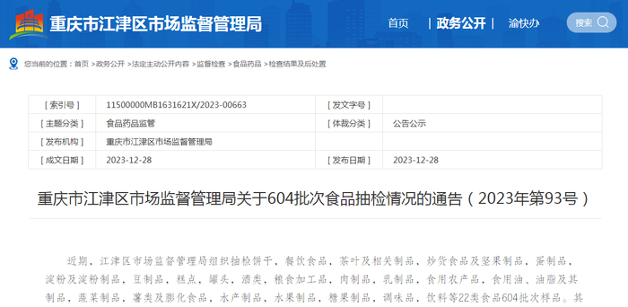 重庆市江津区市场监督管理局关于604批次食品抽检情况的通告(2023年第93号)