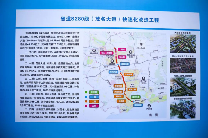 四期是全路面及景观提升。对茂名大道全线路面及景观绿化进行提升改造,总投资2.6亿元,其中建安费1.8亿元。计划2025年3月开工建设,2025年底完成建设。