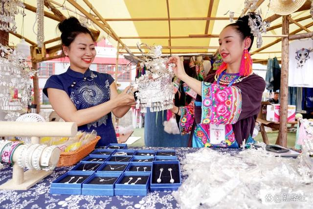 在“村超”球场旁的“非遗”摊位,身着苗族服装、售卖“非遗”产品的女青年李绍卿,一边给游客介绍产品,一边忙着直播。她说,“村超”火起来后,她的生意比以前好6倍以上,产品供不应求。
