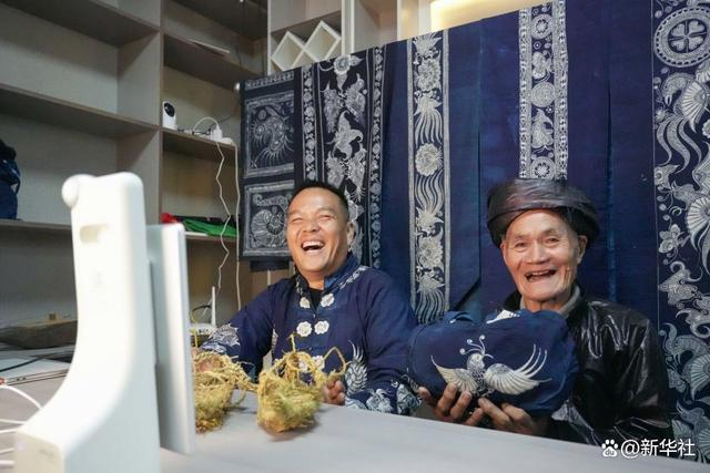 11月7日,在贵州省榕江县摆贝苗寨,贵州“村超”啦啦队队员、86岁苗族老人杨老巷(右)回村后与年轻人一起直播介绍民族文化。