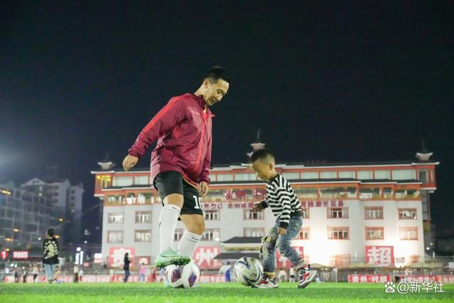 11月7日,“村超”球员、餐饮从业者董永恒在贵州“村超”球场教小朋友踢球。