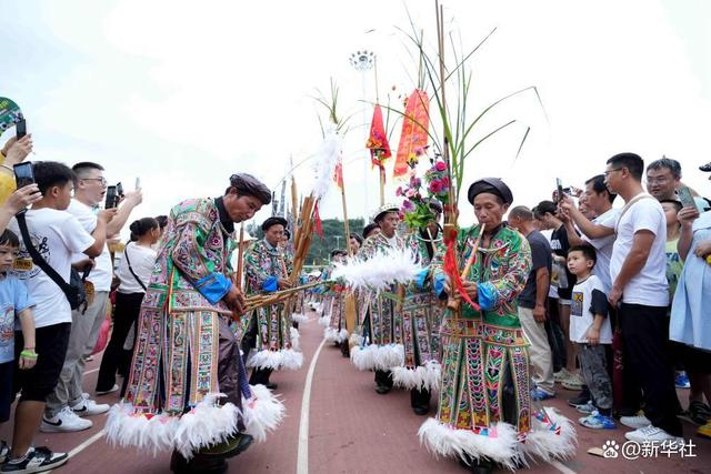 6月23日,在贵州“村超”球场,村民自发组成的民族歌舞表演队吹芦笙入场。