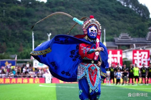 8月26日,来自四川德阳的啦啦队在贵州“村超”全国美食足球友谊赛现场表演川剧变脸。