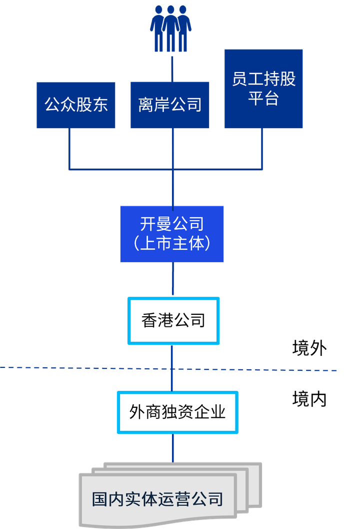 目前内地企业赴港上市的架构主要包括红筹架构和H股架构,其中红筹架构具有较强的灵活性,可以同时满足境外上市要求,因此,成为不少拟赴港上市企业的首选。港股上市企业常见的持股架构图如下: