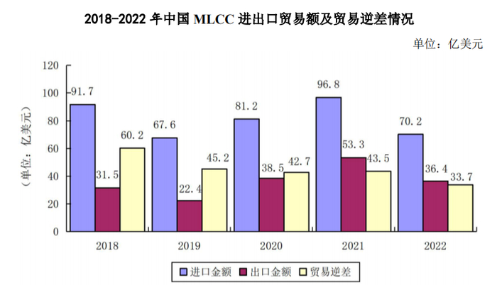 达利凯普招股书显示,近五年,中国MLCC贸易逆差均在30亿美元以上,2018年高达60.2亿美元。不过,MLCC贸易逆差逐年下降,2022年的数据是33.7亿美元,相比2018年降幅明显,主要原因系达利凯普等本土企业自主创新与崛起,带动MLCC国产化率的提升。