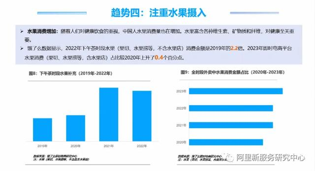 饿了么数据显示,随着餐饮服务范围扩大,用户通过平台购买的餐品种类越来越丰富,2022年用户年平均购买餐饮品类数比2019年增加了0.7个,其中2022年标注全谷物食物的菜品数是2019年的1.6倍,说明了消费者对健康饮食的高度关注。全民追求饮食“营养”“健康”大趋势凸显,低卡食品供给增加,饿了么数据显示,2022年低卡食品的餐饮店铺较2019年增加了217%,商品数增加123%。水果消费量也在增加,2022年下午茶时段水果(果切、水果捞等,不含水果店)消费金额是2019年的2.2倍,2023年即时电商平台水果消费占比也较2020年上涨了0.4个百分点。