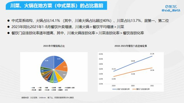 餐饮行业中餐占比保持绝对优势,线下78%以上,线上80%以上;餐饮外卖消费者(青年消费者)更偏好中餐。2020年至2023年,地方菜中中餐比例稳定保持在15%左右,而川菜的影响力首屈一指,稳居地方菜市场第一。在中式菜系结构汇总,火锅占比14.1%(其中川渝火锅占比超过40%),川菜占比13.7%分别居第一、二位。2023年同比2021年1-8月餐饮外卖增速,川渝火锅高于平均线;另一方面,餐饮门店连锁化率逐年提高,川渝火锅的连锁化率也高于餐饮连锁化率。川渝火锅以其独特的特色和魅力,吸引了更多投资者愿意采用连锁化经营模式,发展潜力巨大。