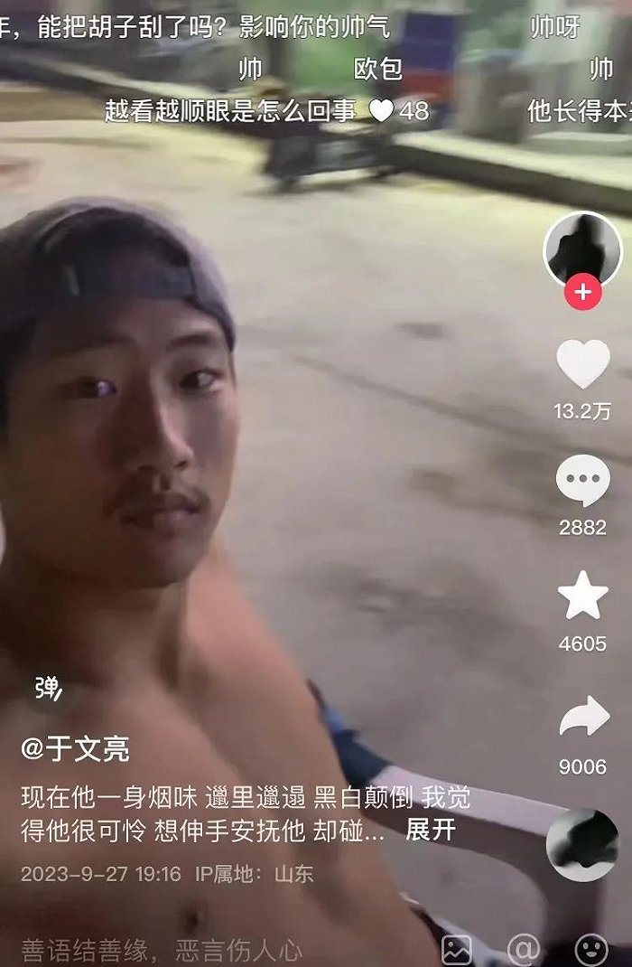 于文亮在今年9月27日发表第一支视频,视频中的他赤裸上身,穿着短裤,镜头怼脸,搭配抖音热门BGM,就这样不知所云的一条视频为其赢得十余万点赞。