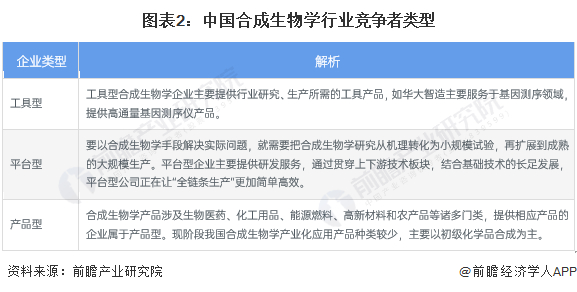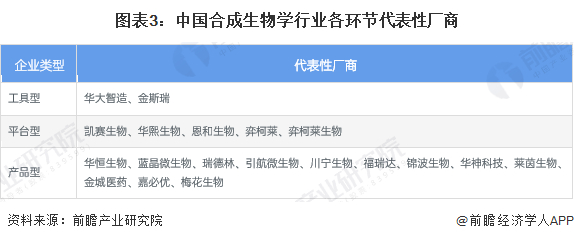 合成生物学产业可以划分为上、中、下游三个部分,分别代表工具型、平台型和产品型三个类别,对应三种商业模式。分别是以销售工具、试剂、材料产品为主的工具型模式;以协助研究开发,提供技术服务的平台型模式;以生产销售合成生物学产品的产品型模式。
