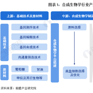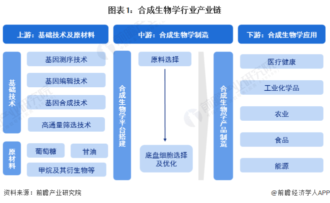 合成生物学主要指使用已有的或改造过的基因模块通过工程学手段拼装、搭建一个自然界中根本没有的生命体系。因此,合成生物学是一门以工程学思想为指导、多学科结合的新兴领域,通过一系列重新设计与技术改造生物体或细胞以使其具有新的能力,在此过程中设计与构建一系列新的标准化的生物元件、组件与系统,以实现理想的生物制造能力。其上游包括基础技术及原材料、中游为合成生物学制造,包括平台搭建与产品制造,下游则是应用领域,涉及医疗、农业、工业、食品等多个领域。