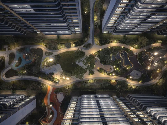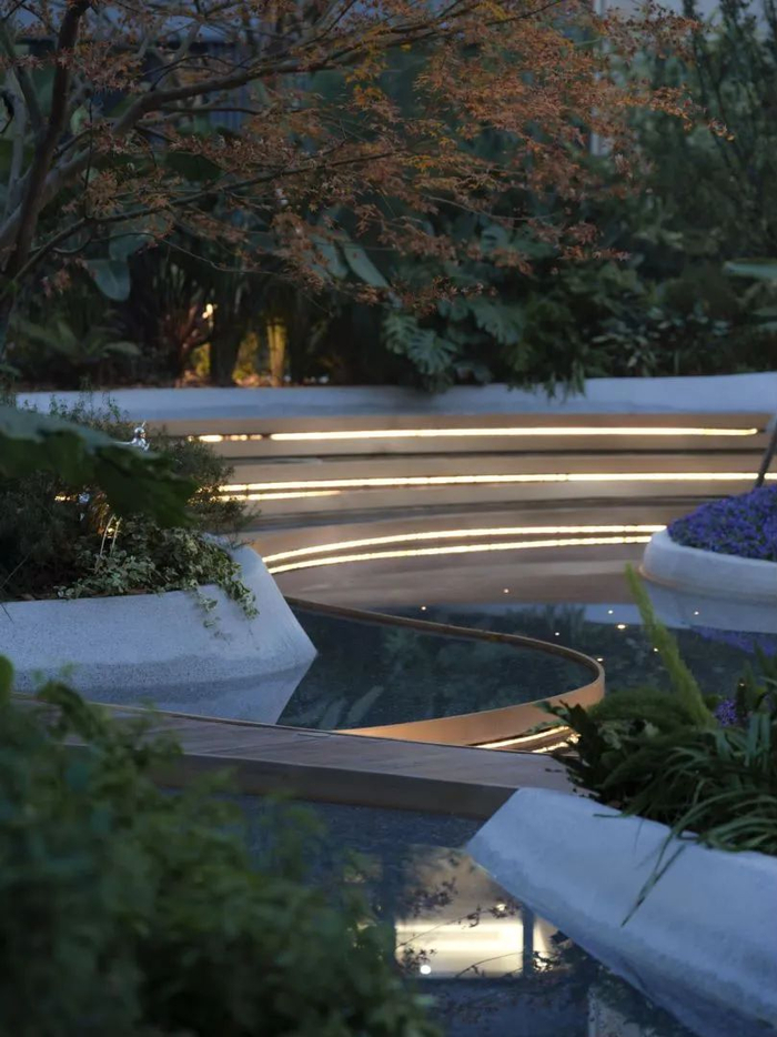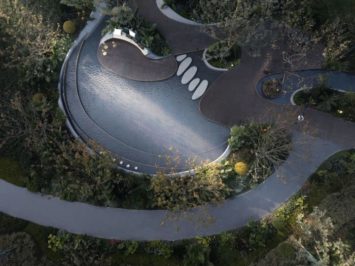 整个园林利用“曲线构造”的地面铺砖叠加大量迭步水景,将一个纵向约260米、占地约40000㎡的景观主轴进行切分和有机串联,并汲取在地特色的川西林盘,营造出“一步繁华,一步安逸”的高浓度生活场景。