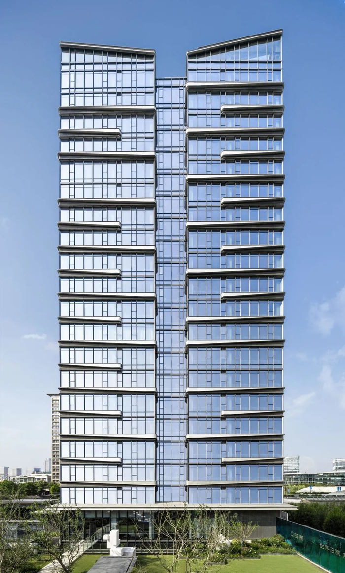在冬日暖阳照射下,超大倒角的弧度蓝灰色Low-E玻璃,配合极有序列感的格栅,以及金香槟色的横向铝板+低饱和度石材涂料,渲染出一抹轻奢典雅的调性。