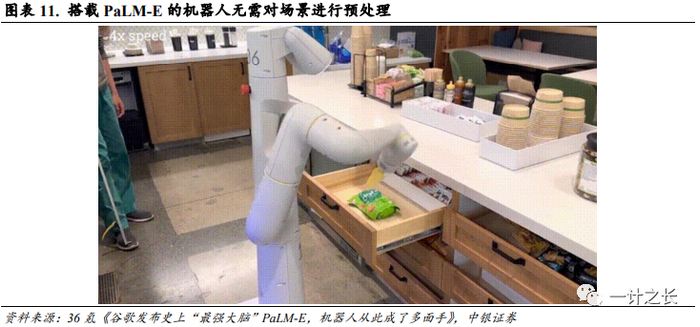 当被要求执行“把抽屉里的薯片拿给我”的任务的时候,PaLM-E首先对机器人相机的数据进行分析,而非对场景进行预处理(消除了人类预处理或注释数据的需要),以实现更自主的机器人控制。随后PaLM-E引导机器人从厨房取出薯片袋,当研究人员从机器人拿走薯片后,机器人仍然能找到薯片并再次抓取它们。