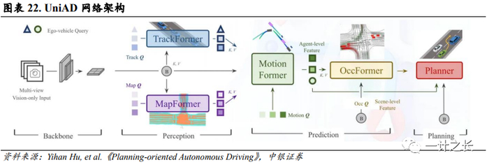 UniAD成为国内首个端到端自动驾驶大模型。6月21日,全球人工智能和计算机视觉领域顶级国际会议CVPR2023宣布由上海人工智能实验室、武汉大学及商汤科技联合发表的论文《以路径规划为导向的自动驾驶》(Planning-oriented AutonomousDriving,UniAD)获最佳论文奖。在UniAD中,研究人员首次将感知、预测和规划等三大类主任务、六小类子任务(目标检测、目标跟踪、场景建图、轨迹预测、栅格预测和路径规划)整合到一个基于Transformer的端到端网络框架下,实现了全栈关键任务驾驶通用模型。在nuScenes真实场景数据集下,UniAD的所有任务均达到领域最佳性能(State-of-the-art,SOTA),尤其是预测和规划效果方面。其中,多目标跟踪准确率超越SOTA 20%,车道线预测准确率提升30%,预测运动位移和规划的误差则分别降低38%和28%。