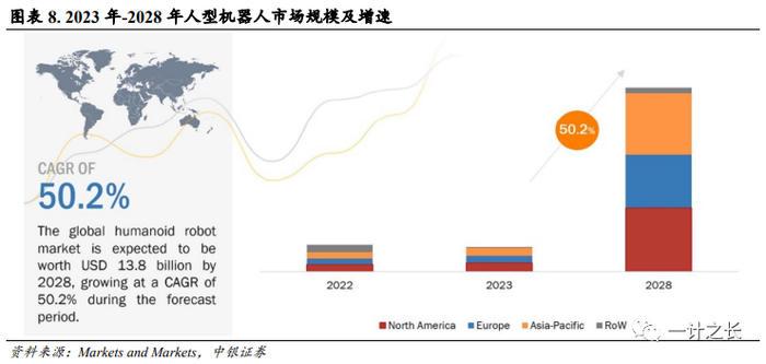 具身智能体市场空间广阔,5年市场规模CAGR有望超50%。智能体目前仍处于发展初期阶段,其与机器人、自动驾驶、智能传感器和智能设备、增强现实(AR)和虚拟现实(VR)等多个行业相关,市场空间广阔。以人形机器人市场规模进行参考,据Markets and Markets测算,到2028年全球人形机器人市场规模将达到138亿美元,复合增长率预计为50.2%。
