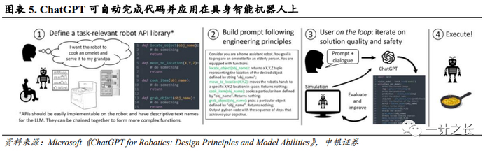 微软在《ChatGPT for Robotics: DesignPrinciples and Model Abilities》中提出,大语言模型(LLM)能给机器人提供常识,非工程师也可对机器人进行控制。操控者只需准备好机器人底层的函数库,并对其进行描述。将任务目标告诉ChatGPT后,ChatGPT即可自动完成代码并应用在具身智能机器人上。以居家机器人为例,设计者只需写出机器人进行物品定位、移动到某一位置、抓取物体以及做饭的函数库,然后告知ChatGPT相应函数的作用以及要到达的目标,ChatGPT就会自动写出相应代码。