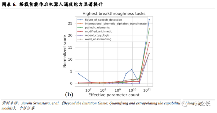 搭载智能体后机器人涌现能力显著提升,可完成没有预先编程的新场景。7月谷歌DeepMind推出机器人模型Robotics Transformer 2(RT-2)。RT-2以视觉-语言模型(VLMs)为基础,以Pathways Language and Image model(PaLI-X)和 Pathways Language model Embodied(PaLM-E)为支柱,通过输入图像生成一系列自然语言文本的标记。RT-2可用于执行视觉问答、图像字幕或对象识别等任务。RT-2展现了较好的涌现能力,即从原始训练数据中自动学习并发现新的、更高层次的特征和模式的能力。