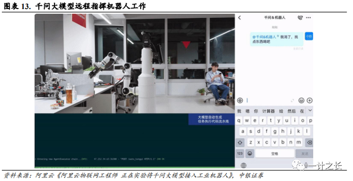 阿里千问大模型有望接入工业机器人。在第六届数字中国建设峰会上,阿里巴巴董事会主席兼CEO、阿里云智能集团CEO张勇透露:阿里云工程师正在实验将千问大模型接入工业机器人。接入千问大模型后,在钉钉对话框输入人类语言,操作者即可远程指挥机器人工作。通过钉钉对话框向机器人发送“我渴了,找点东西喝吧。”的指令后,千问大模型在后台自动编写代码发给机器人。机器人对周边环境进行识别,在找到水后,自动完成移动、抓取、配送等一系列动作,并顺利递送给工程师。