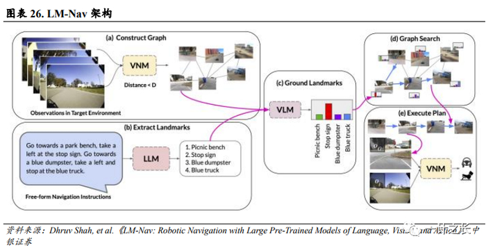 LM-Nav主要针对导航场景。LM-Nav主要基于大型语言模型(LLM)、视觉和语言模型(VLM)以及视觉导航模型(VNM)。其中VNM负责根据环境中的观测值构建拓扑图,LLM用于提取指令中的地标,VLM对所描述的地标和图像的联合概率分布进行推断。之后系统利用 VLM 的概率分布和 VNM 推断的图连接性,从环境中检索出最优指令路径,并由VNM进行执行。在没有微调的情况下,LM Nav可实现无需对机器人导航数据进行人工注释。