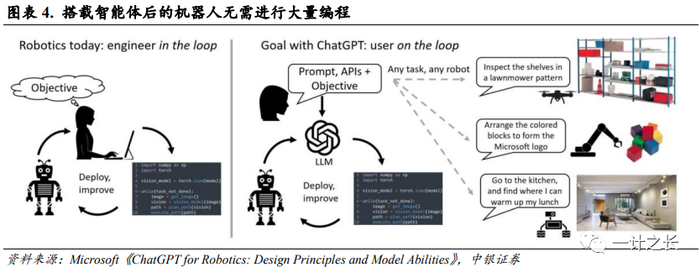 由智能体赋能的机器人以任务完成为导向,相比传统机器人大大减少了编程的需要。传统模式下,机器人以程序执行为导向,通常需要经过任务定义、将任务分解为动作、编写程序以及执行任务等流程。工程师需要构建高低级指令代码,并且随时更改代码以修正机器人行动,整个过程耗时长且成本昂贵。而搭载智能体的机器人以任务目标为导向,不仅仅是机械地完成程序。具身的智能体可以根据环境变化,对行动细节进行实时修正,其自主学习能力能够消除在特定条件下为特定任务反复编程的需要。