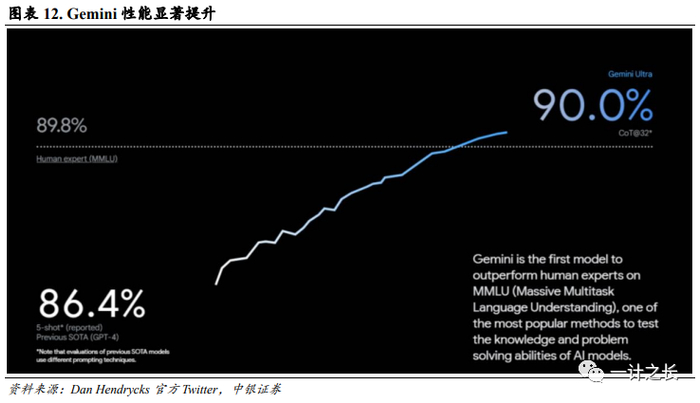 Gemini具备强泛化能力,有望成为机器人智能体。12月6日,谷歌原生多模态大模型Gemini发布。Gemini可泛化并无缝理解、操作和组合不同类型的信息,包括文本、代码、音频、图像和视频。它包括三种量级:能力最强的 Gemini Ultra,适用于多任务的 Gemini Pro 以及适用于特定任务和端侧的Gemini Nano。其中Ultra版可用于大型数据中心等,属于处理高复杂度任务的模型;Pro版则用于各种扩展任务,属于日常使用模型,目前已搭载于谷歌的对话机器人Bard中;Nano版则是应用于智能手机等移动设备终端上的模型。与BERT等模型相比,Gemini具有更多的参数和更深的网络结构,此外Gemini还采用了更先进的训练方法,例如知识蒸馏和自监督学习等,模型泛化能力显著提升。在GLUE和SQuAD等多项自然语言处理基测试中,Gemini分别取得了94.1%和93.3%的准确率。谷歌人工智能高管哈萨比斯在接受杂志Wired采访时表示,谷歌DeepMind已经在研究如何将Gemini与机器人技术结合起来,与世界进行物理互动。