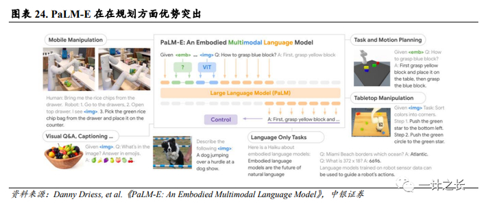 谷歌打造“通才”AI模型PaLM-E。3月,谷歌联合柏林工业大学团队发布PaLM-E(Pathways Language Model with Embodied),参数量高达5620亿。PaLM-E是PaLM-540B语言模型与ViT-22B视觉Transformer模型的结合,它基于谷歌现有的“PaLM”大语言模型 (类似于ChatGPT背后的技术)。谷歌通过添加感官信息和机器人控制,使PaLM“具身化”。PaLM-E可以连续观察图像信息或传感器数据,并将它们编码为一系列与语言标记大小相同的向量,使得模型以与处理语言相同的方式“理解”感官信息。同时,PaLM-E还借鉴了谷歌之前在ViT-22B视觉Transformer模型上的工作。ViT-22B接受过各类视觉任务的训练,如图像分类、对象检测、语义分割和图像字幕。作为多模态具身视觉语言模型(VLM),PaLM-E不仅可以理解图像,还能理解、生成语言,还可以执行各种复杂的机器人指令而无需重新训练。