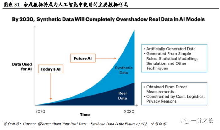 数据仿真有望成为产业突破关键。区别于非具身智能,具身智能需要实际部署到真实环境中,才能够采集数据,但目前探索真实环境成本高昂且需要海量数据。智元机器人CTO、首席架构师稚晖君在接受媒体甲子光年的采访中表示,现在LLM的预训练通常需要web-scale级别的数据,而具身智能的场景更为复杂,数据获取难度进一步加大。而数据仿真具备完善的数据分布,不仅涵盖 common case,同时也涵盖大量 corner case,尤其是现实中获取难度极大,获取代价极高的数据。其数据成本低且可以规避数据隐私和安全问题。根据《Will we run out of data?An analysis of the limits of scaling datasets in Machine Learning》文中预测,2026年文本数据将被训练完,而图像数据将在2040年左右耗尽。根据Gartner的预测,2026年模型训练数据中的50%将由合成数据构成;2030年合成数据的质量将全面超过人类标注的真实数据。数据仿真或将成为产业突破关键。