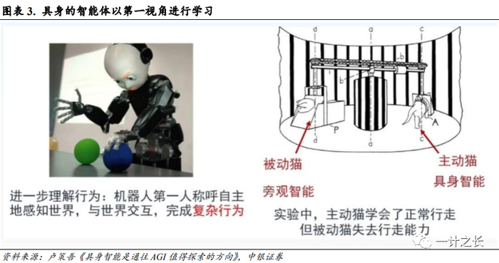 智能体相比传统深度学习模型具有自主学习的能力。CV、NLP等传统深度学习模型主要通过第三视角以互联网图像、视频或文本等数据集进行学习,其训练主要依靠被动数据投喂。而具身的智能体以第一视角进行感知,并与环境交互,不依靠被动数据投喂,具备主动学习的能力以及较强的泛化性。1963年,麻省理工学院教授理查德·赫尔德通过对比实验发现:当猫的脚被绑住放进盒子里时,即使其能正常观察环境,但并不能发育出正常的视觉能力;而另一只可以自由行走的猫在完全相同的环境下,则发育出了正常的视觉能力,因而他认为只有“具身”的训练,才能真正学习与理解外部的环境与信息。
