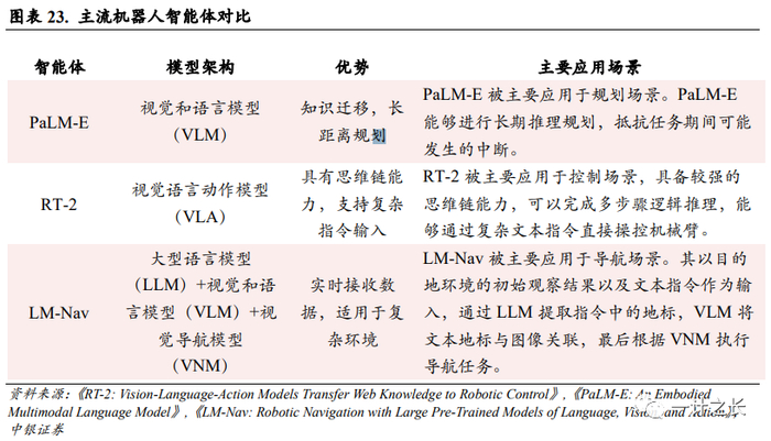 机器人领域尚未形成底层通用大模型。根据达闼机器人创始人、董事长兼CEO黄晓庆9月20日在2023亚布力智能制造发展论坛上的发言,Robot GPT是智能制造领域需要的各种垂直的、从事各种生产的通用机器人的大脑,可以传承各种长期积累的工作经验,且不需要人类编程,只需要人类以自然语言的方式来进行记录。但当下机器人在不同的技能情况下仍需要不同的大模型,底层通用平台尚未形成。目前机器人领域主流的具身智能大模型主要包括谷歌PaLM-E、Robotic Transformer 以及LM-Nav等,这些大模型各自针对不同细分场景。