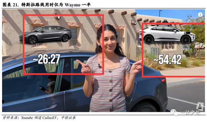 在8月26日马斯克45分钟直播试驾中,FSD Beta V12在面对之前从未见过的建筑、道路标志时能够进行识别,并轻松绕过障碍物。对于同样未经过编程的环形交叉路口概念,FSD V12顺利完成转弯行驶。只需输入目的地地址,FSD V12就可自动行驶到达目的地,并将车停到合适的位置。YouTube博CallasEV将特斯拉FSD与Waymo进行了长距离驾驶对比。从同一地点出发到同一终点,Waymo全程用时54分42秒,而特斯拉的路线用时仅为26分27秒,用时不到Waymo的一半。